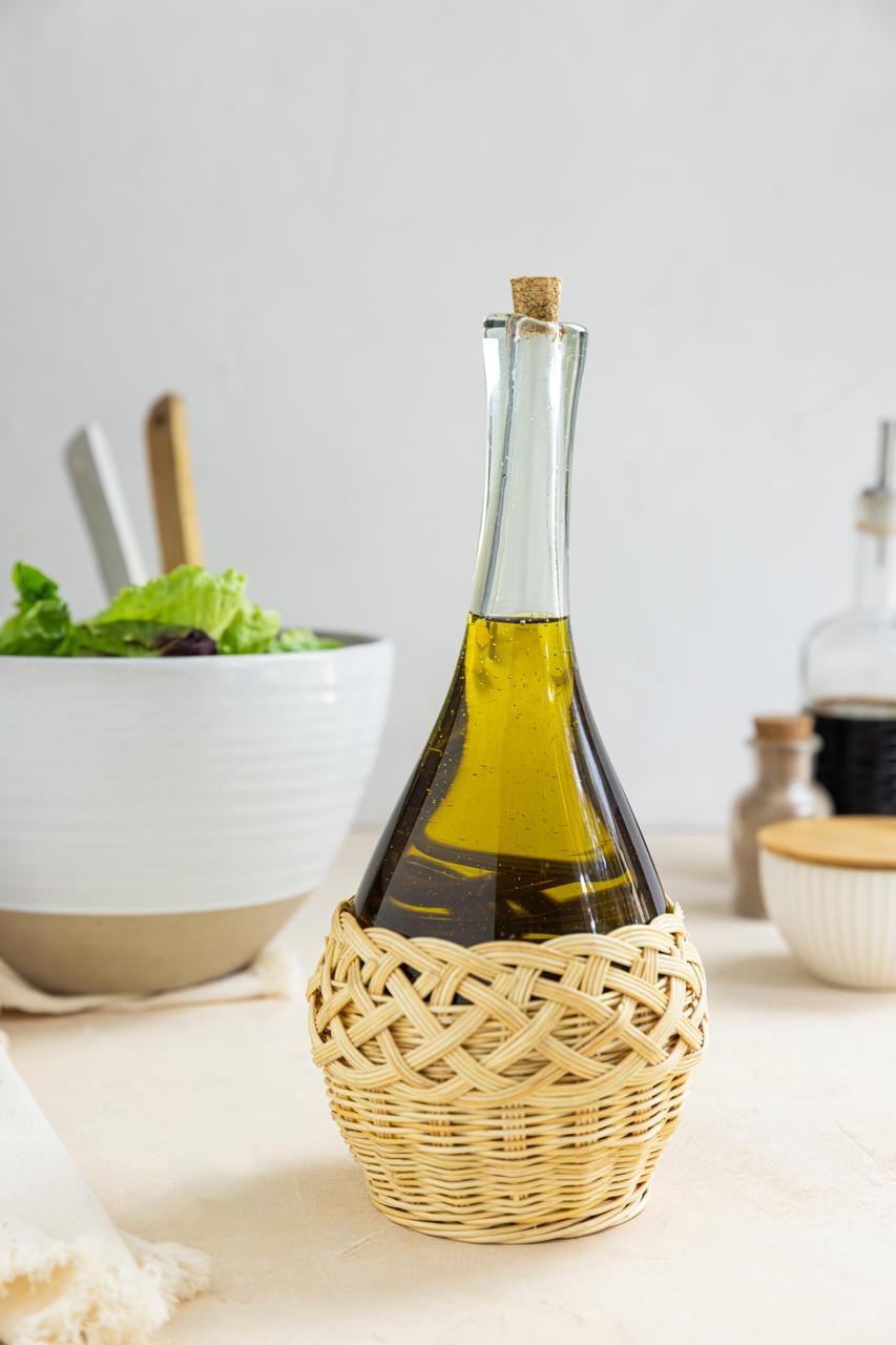 Aceitera en vidrio con canasta de sauce de 20 cm de alto