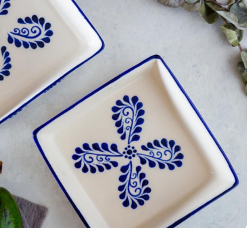 Charola cuadrada de cerámica alta temperatura modelo tradicional pintada a mano, medida 22x22x5 cm.
