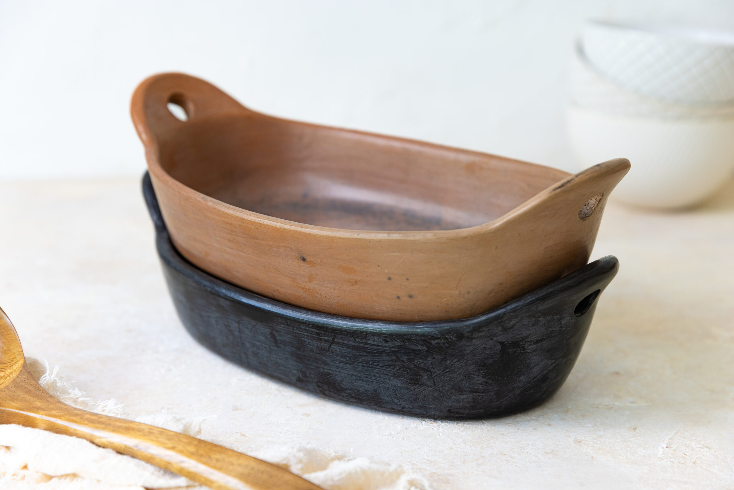 Charola ovalada de barro bruñido libre de plomo, medidas aproximadas 30×19 cm.
