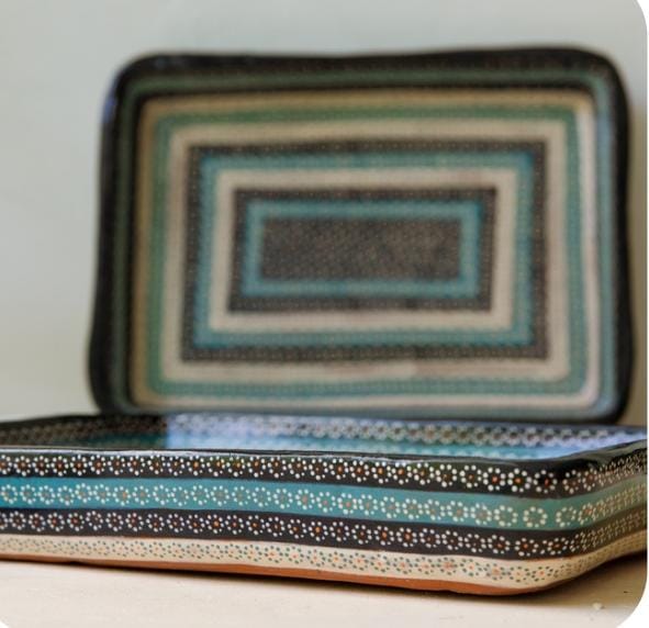 Charola rectangular de barro capuleado libre de plomo, modelo arcoíris medidas 25x30x5 cm.