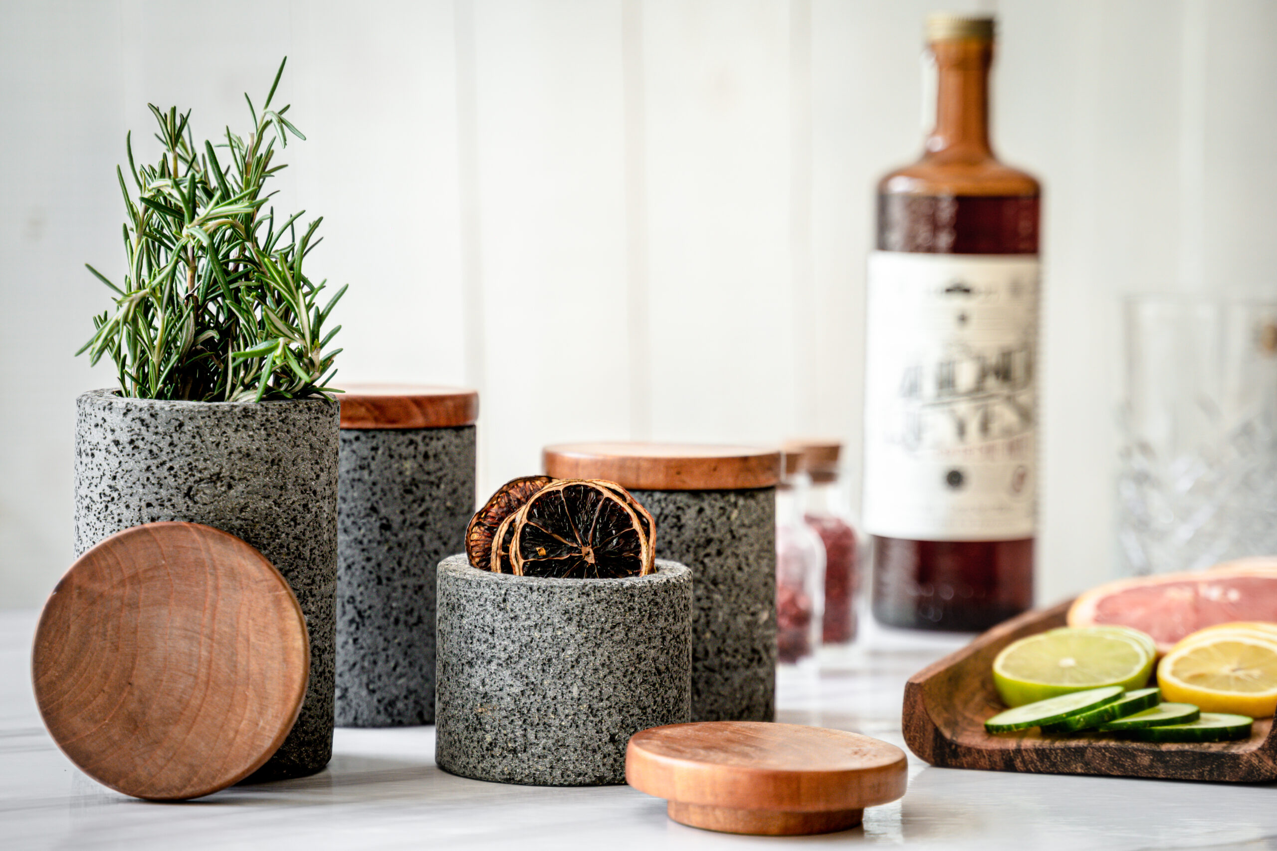 Frasco de piedra volcánica con tapa de madera