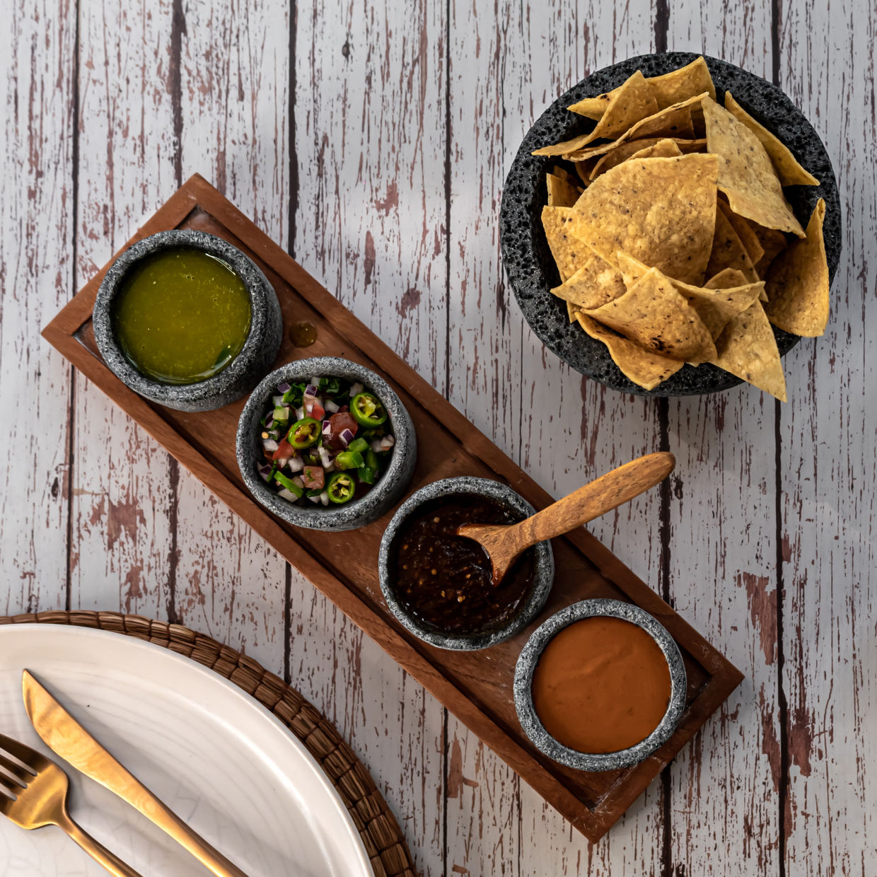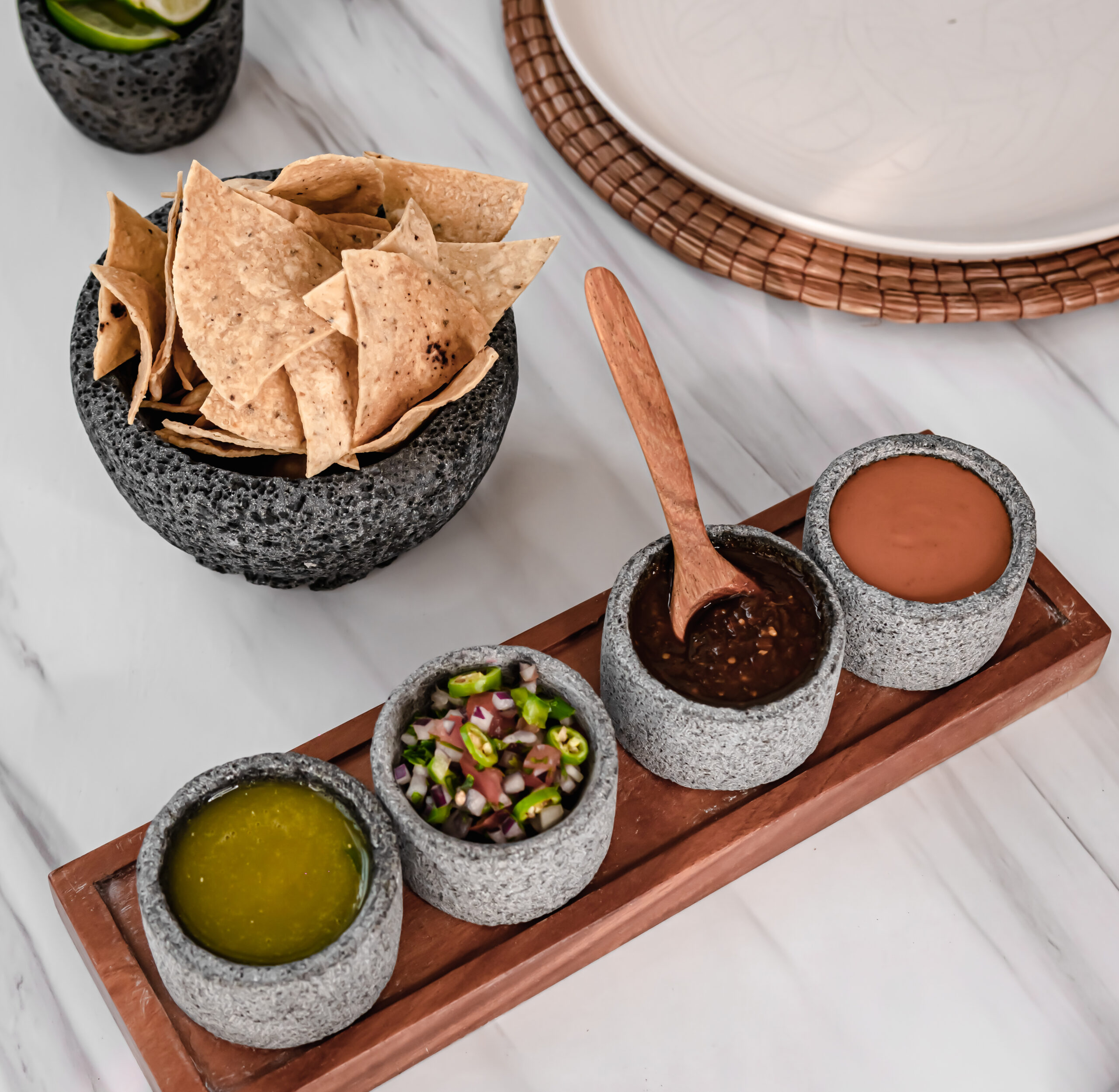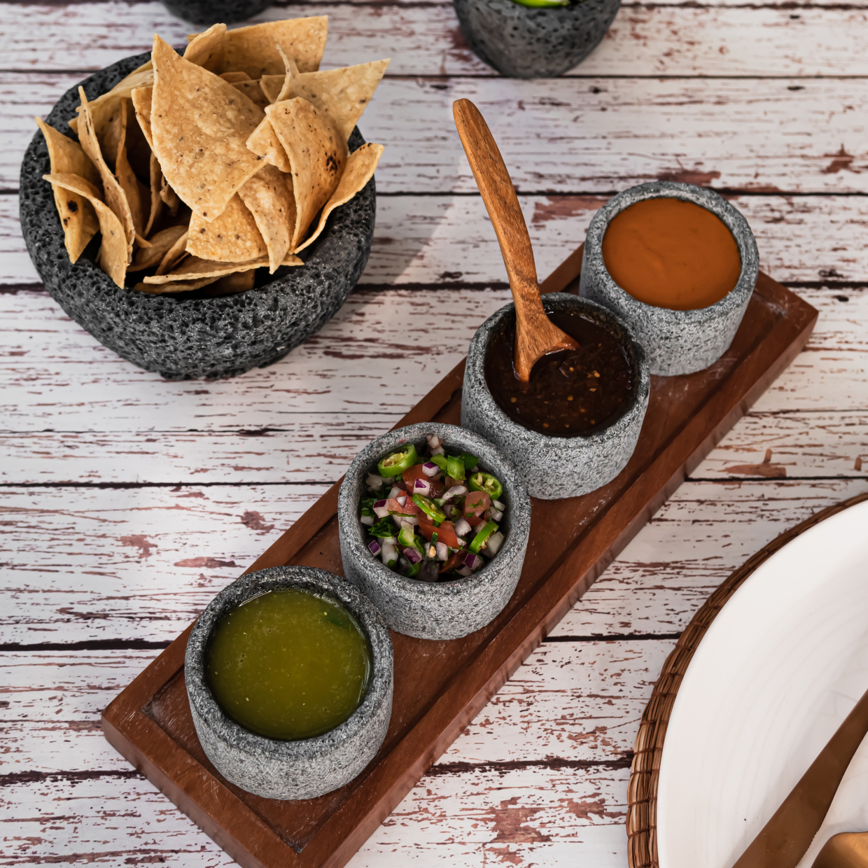 Juego de 4 salseros de piedra volcánica, incluye base de madera de tzalam, no incluye cucharas.