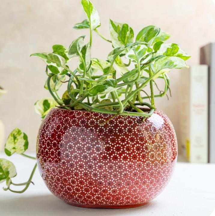 Maceta de barro capuleado modelo bola, medida 13×12 cm.