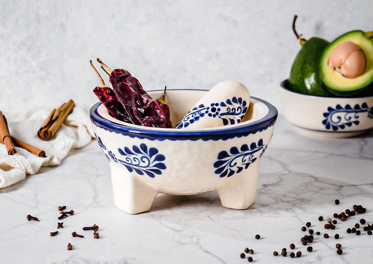 Molcajete extra de cerámica alta temperatura pintada a mano, modelo tradicional medida 20×9 cm.