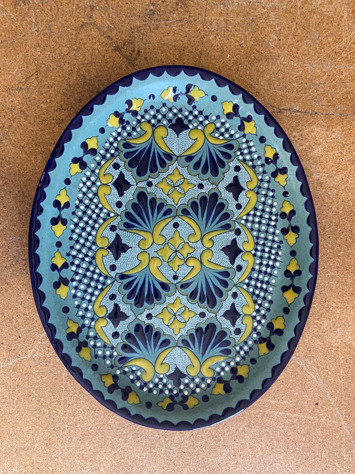 Charola cerámica koolonial pintada a mano modelo Morelia (decorado noelia filo decorado colores esmalte verde moteado) medida 30×24 cm.