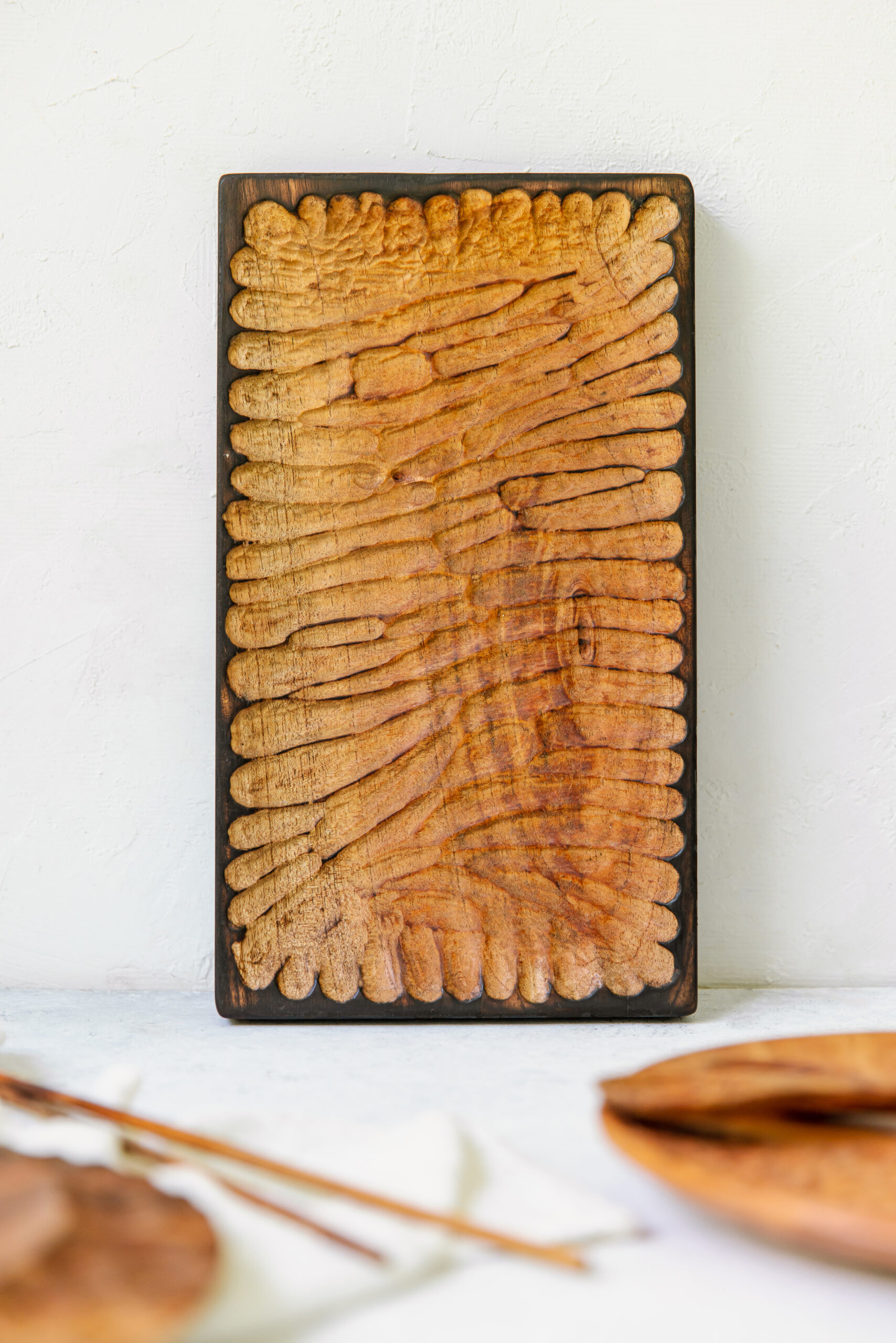 Plato tallado a mano de madera de tzalam con bordes quemados, medida 25×15 cm.