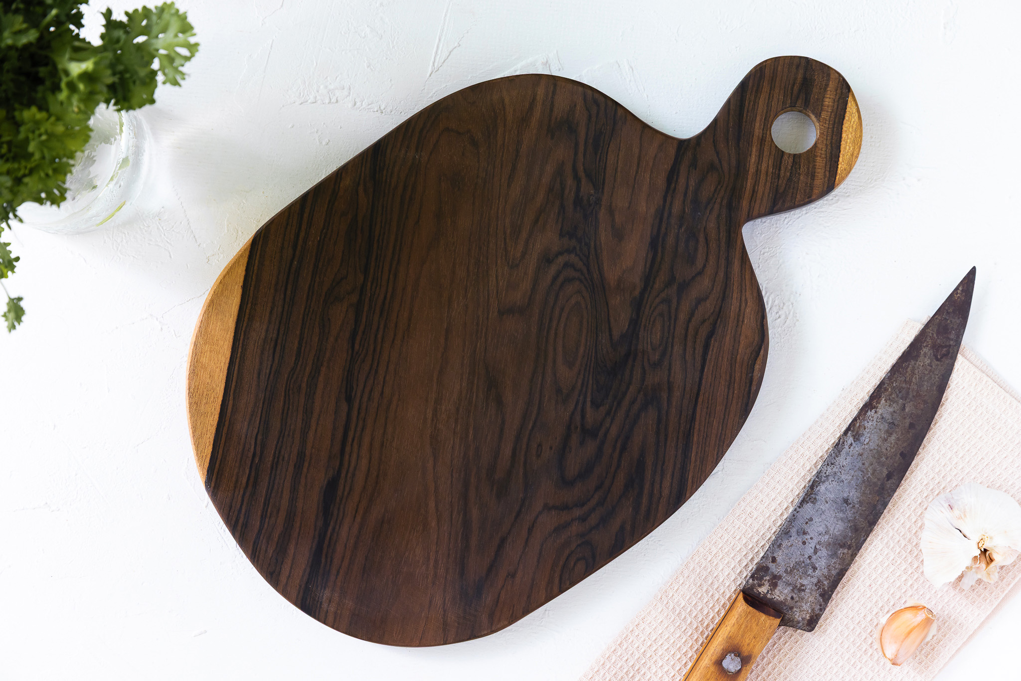 Tabla con asa de madera de ciricote con asa, medida 30×22 cm de diámetro.