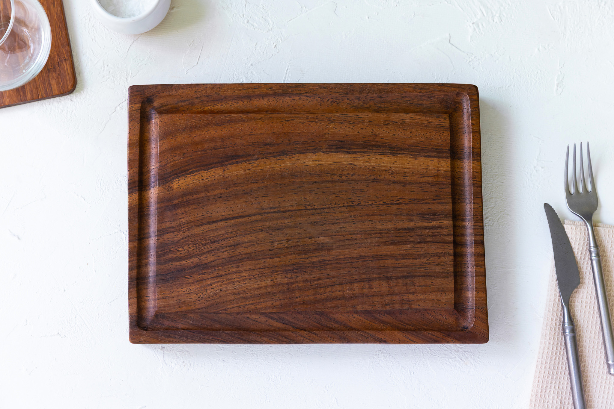 Tabla de madera de tzalam, con canal para grasa y rebaje en los costados, medida 40x32x4 cm.