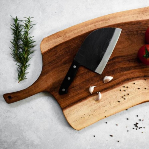 Tabla de madera de parota forma irregular 50×40 cm, 2 cm de grosor más 12 cm del asa 62 cm totales.