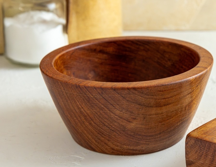 Tazón de madera de guamúchil, medidas 15 cm de diámetro, 7 cm de alto y 10 cm de base.