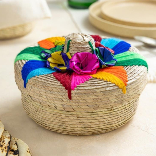 Tortillero tejido en palma con flores de la misma fibra en la tapa, medida 18 cm de diam x 7 cm de alto